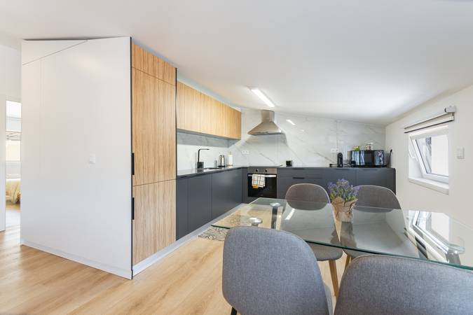 O acesso independente no piso superior do edifício proporciona privacidade. Este edifício possui mais dois apartamentos no andar inferior, mas todos são isolados contra ruído, garantindo um ambiente tranquilo e relaxante.